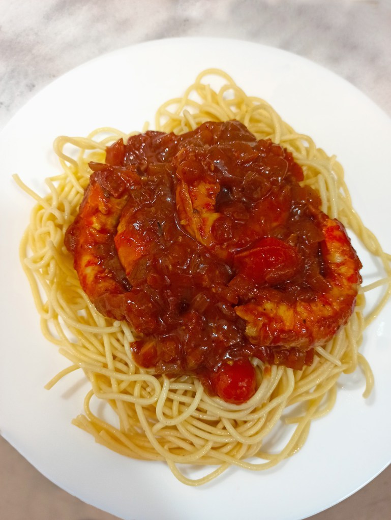 While the spaghetti are being cooked, put the pan with the sauce back on the stove on low heat and add the cleaned shrimps. Make sure they are covered as much as possible by the sauce and let them warm.