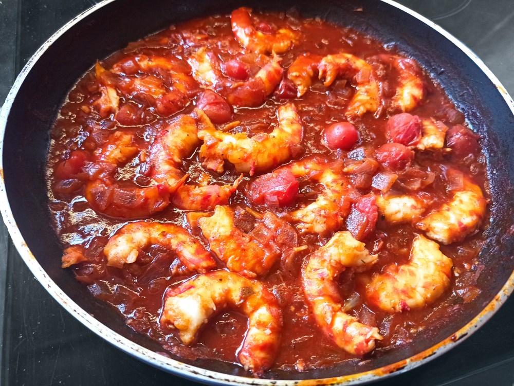 In a pan, add a little olive oil and the onion. Saute it until it becomes slightly transparent. Add the garlic and continue sauteeing. Add the bay leaf and thyme and stir well. Add the cherry tomatoes and vegetable cube and continue stirring. Add the alcohol (I prefer ouzo) and let it evaporate almost completely. Salt and pepper, add the spice mix and throw in the tomato sauce and shrimp broth, as well as a little extra hot water. Let it cook at a low setting, to reduce the sauce and let it become thicket. Taste and if we feel it’s a little salty, add a little more water and let it cook for a little longer.