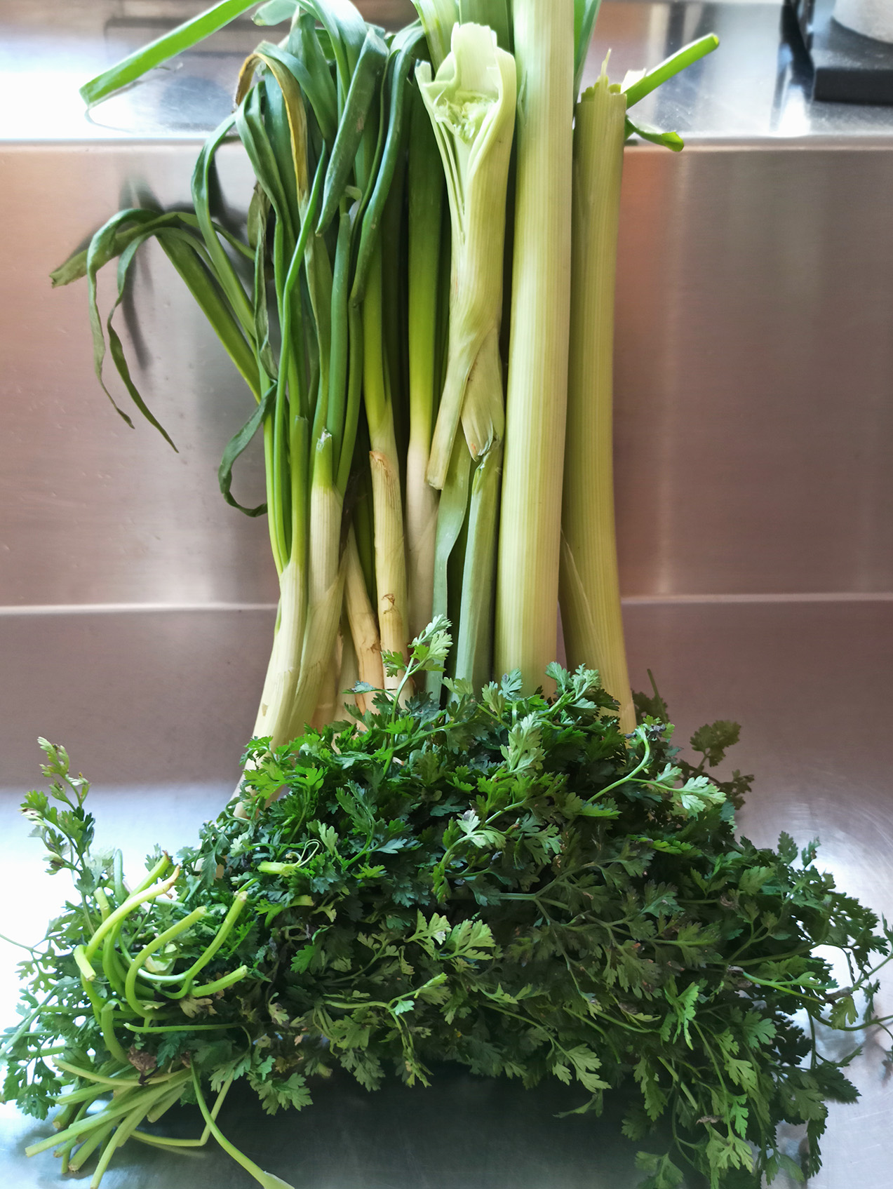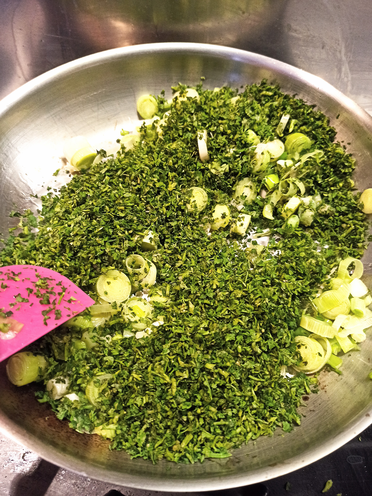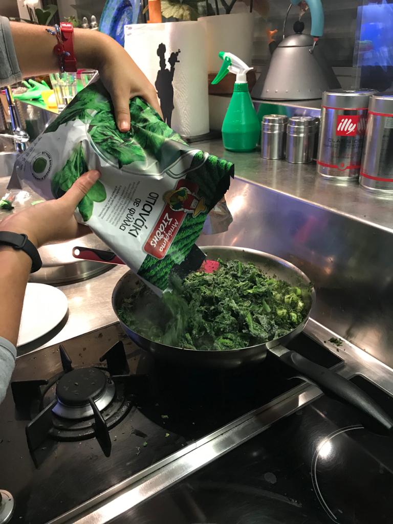Wash thoroughly, clean and chop the greek onions, the myronia, the leeks and the dill and fenel. Put each ingredient into a separate bowl to make it easier for us to get when cooking. It doesn’t matter if our herbs and greens are frozen.