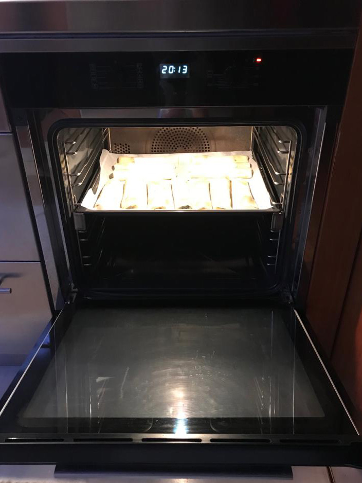 Pre-heat the oven at 180o C. Once its warm, place the trays and cook on the hot air setting for about 20-30 minutes, until they have turned golden. Once the fillo starts browning, switch the trays so that the one that was higher in the oven gets lower and vice versa.