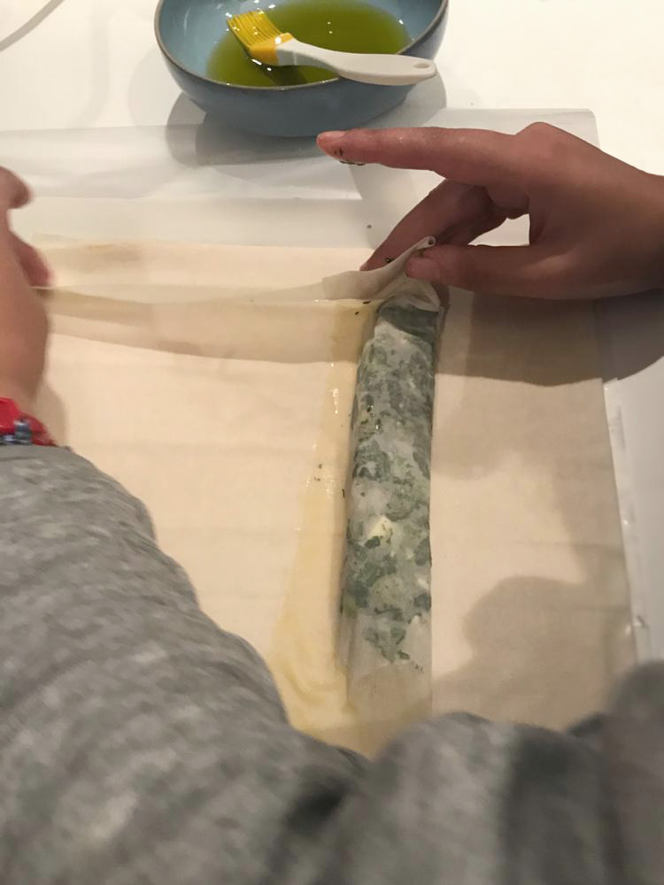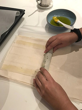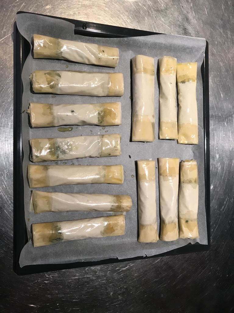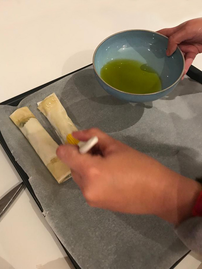 Wrap the short side of the fyllo leaf to cover the filling well and press from all three sides (left, right and short side until immediately after the filling). Wrap the two long sides until the point where the “line” of olive oil ends and press well. Roll the fyllo leaf from the short side until you run out of leaf. Place the roll on the tray with the end of the leaf on the bottom so it will not un-roll and oil it well using the brush. Repeat until you have used all the leaves and / or filling.