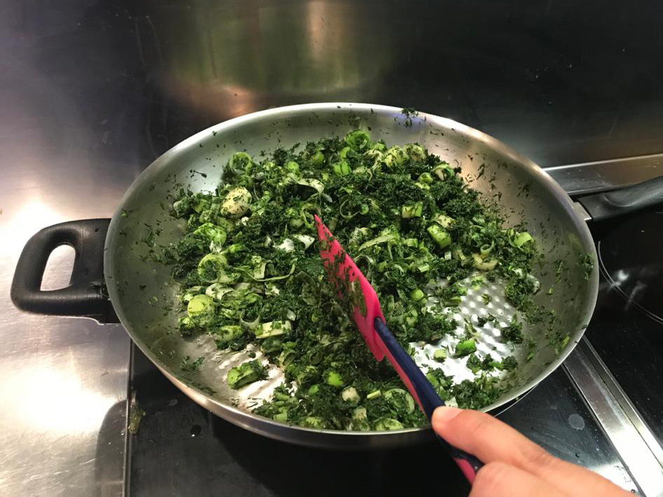 In the deep pan, add the olive oil and green onions. Saute in medium to high heat. Once they start wilting, add the leeks. Saute until the leeks have also wilted. Add the myronia and continue sauteeing. Finally, add the dill and fennel, stir well and cook for a further minute.