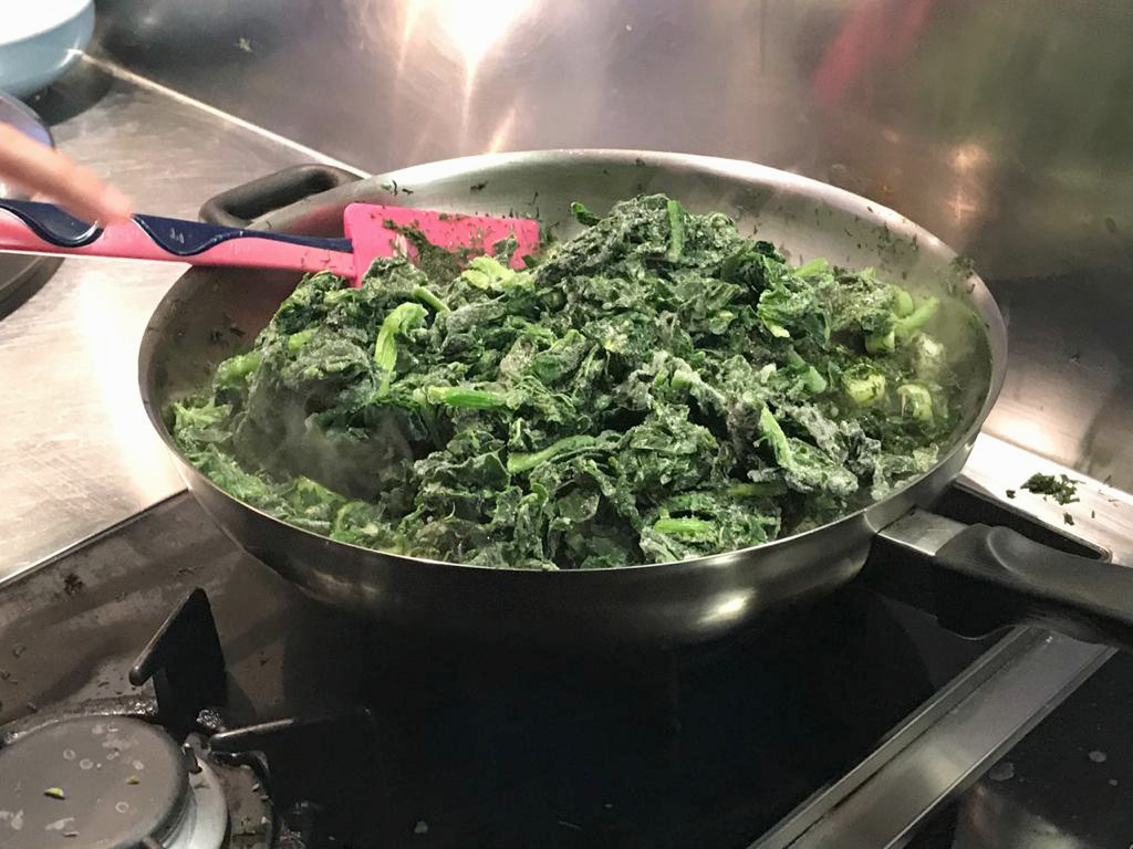 Start adding the spinach little by little, and lower the heat to a medium setting. Each time we add some spinach, we cover the pot with the lid and wait for 1-2 minutes until the ice in our frozen spinach has melted and the spinach has softened. Repeat until we have added and softened all of our spinach and it has been mixed well with the rest of the ingredients. Turn off the heat and remove the pan from the stove.