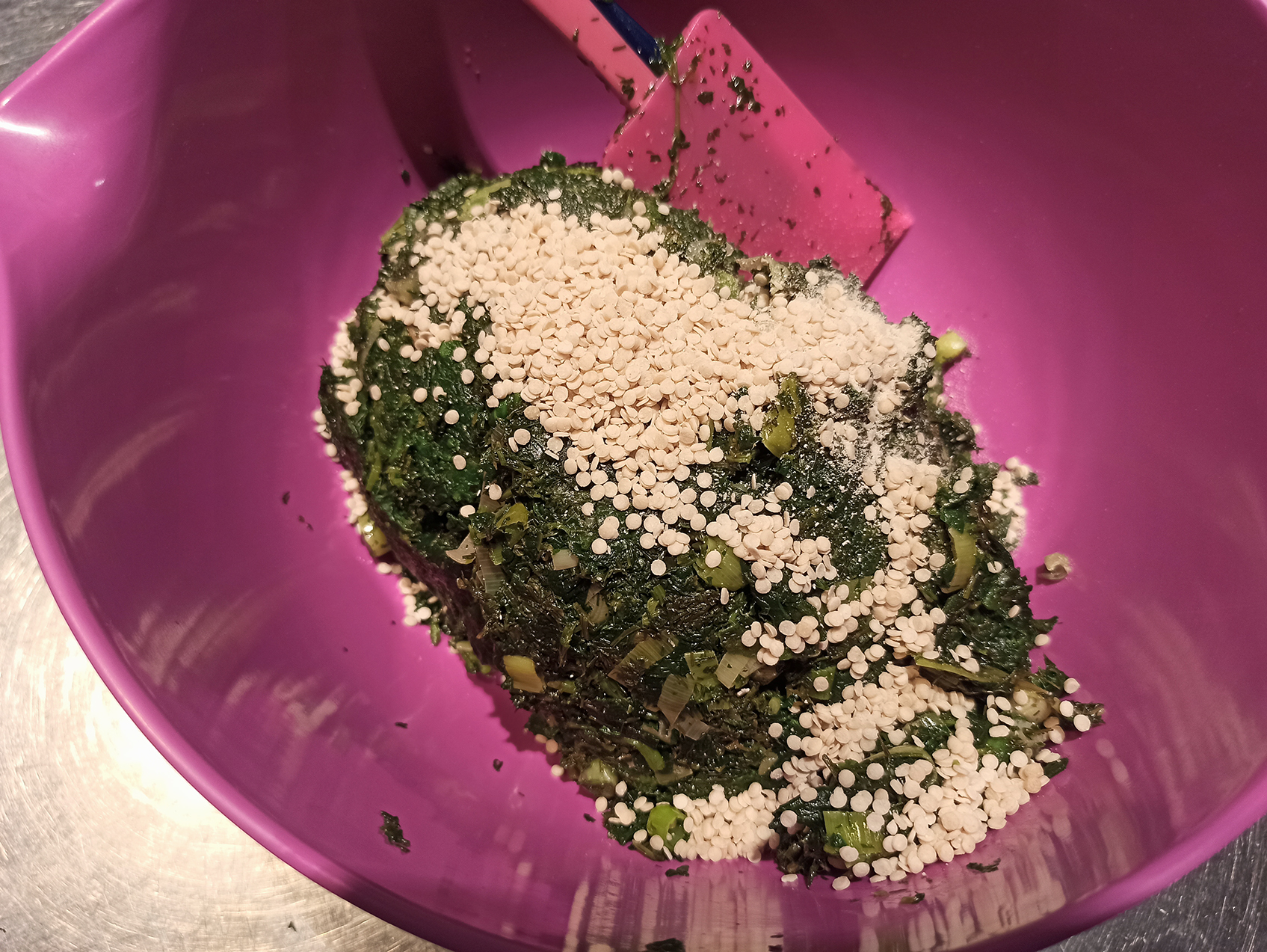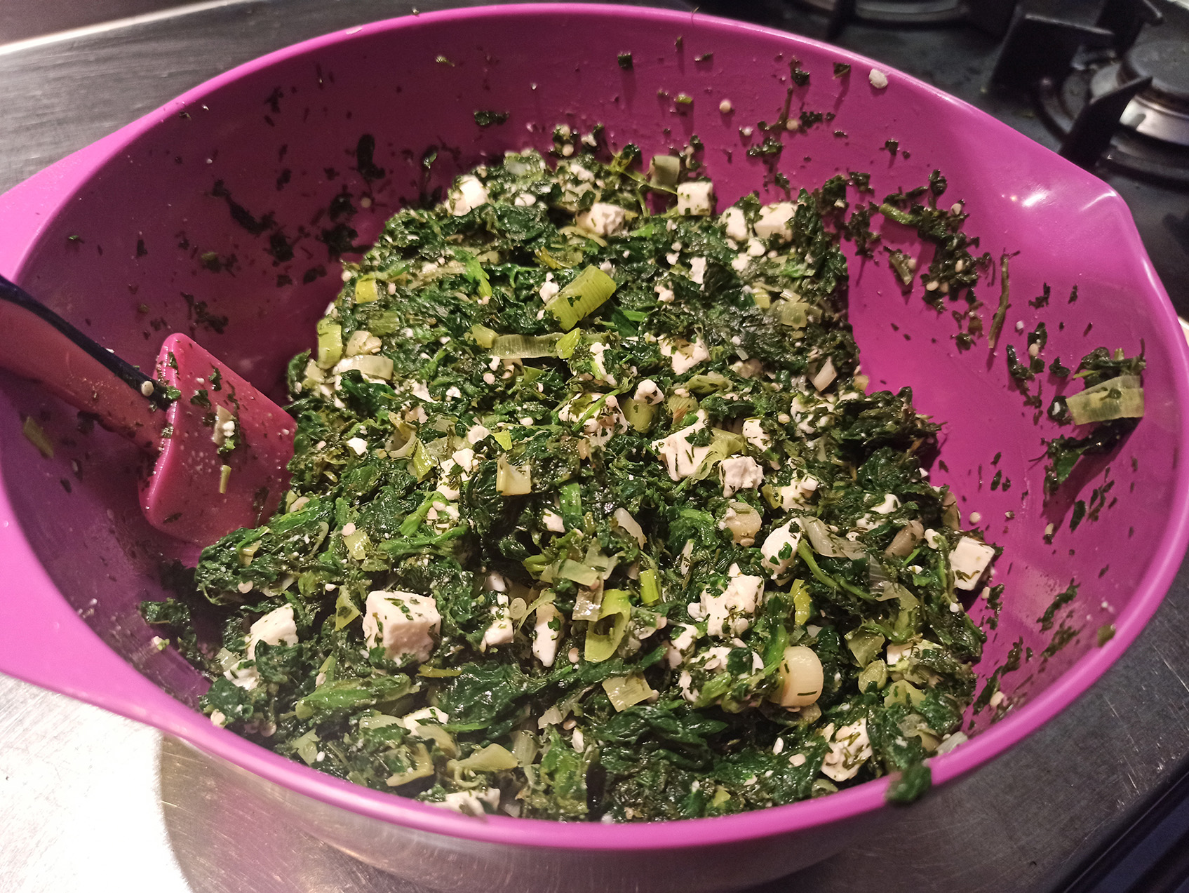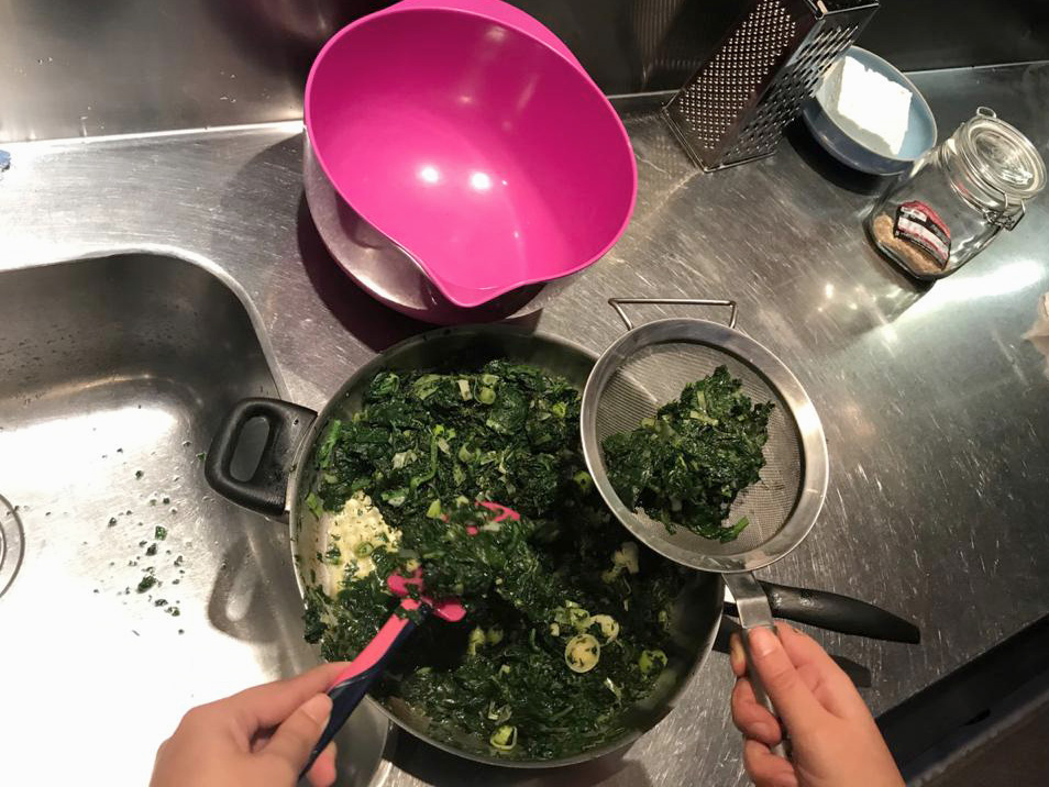 Put a little of our spinach mix in the strainer and press well with the spatula (here, ideally a silicon one) to remove most of the liquid from our mixture. Throw the strained mixture into a bowl. When we have strained all of our spinach mix, add the chopped feta, the trachana, salt and pepper and mix very well.