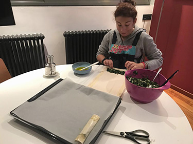 On each fyllo leaf, using the brush, put olive oil on the one short and the two long sides to create a thick “line” of olive oil on each of these sides. With the spoon, add approximately 2 spoonfulls of filling on the short side, immediately after the point where our olive oil “line” ends. Place the filling so it creates a thick “line” until the point where the olive oil on the long sides stops.