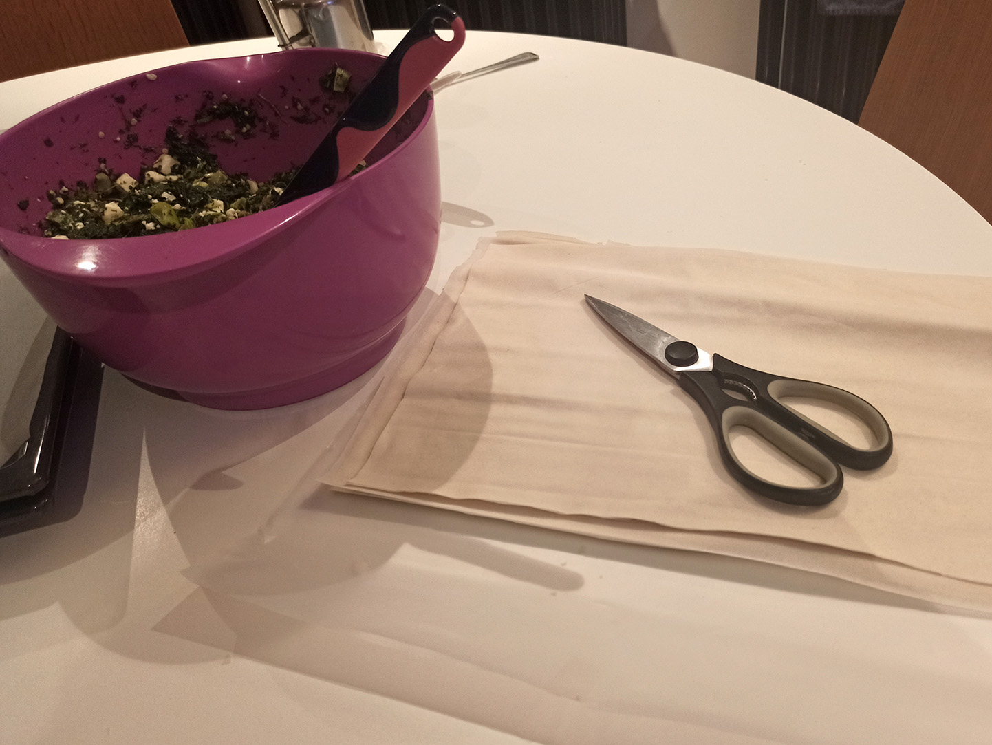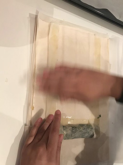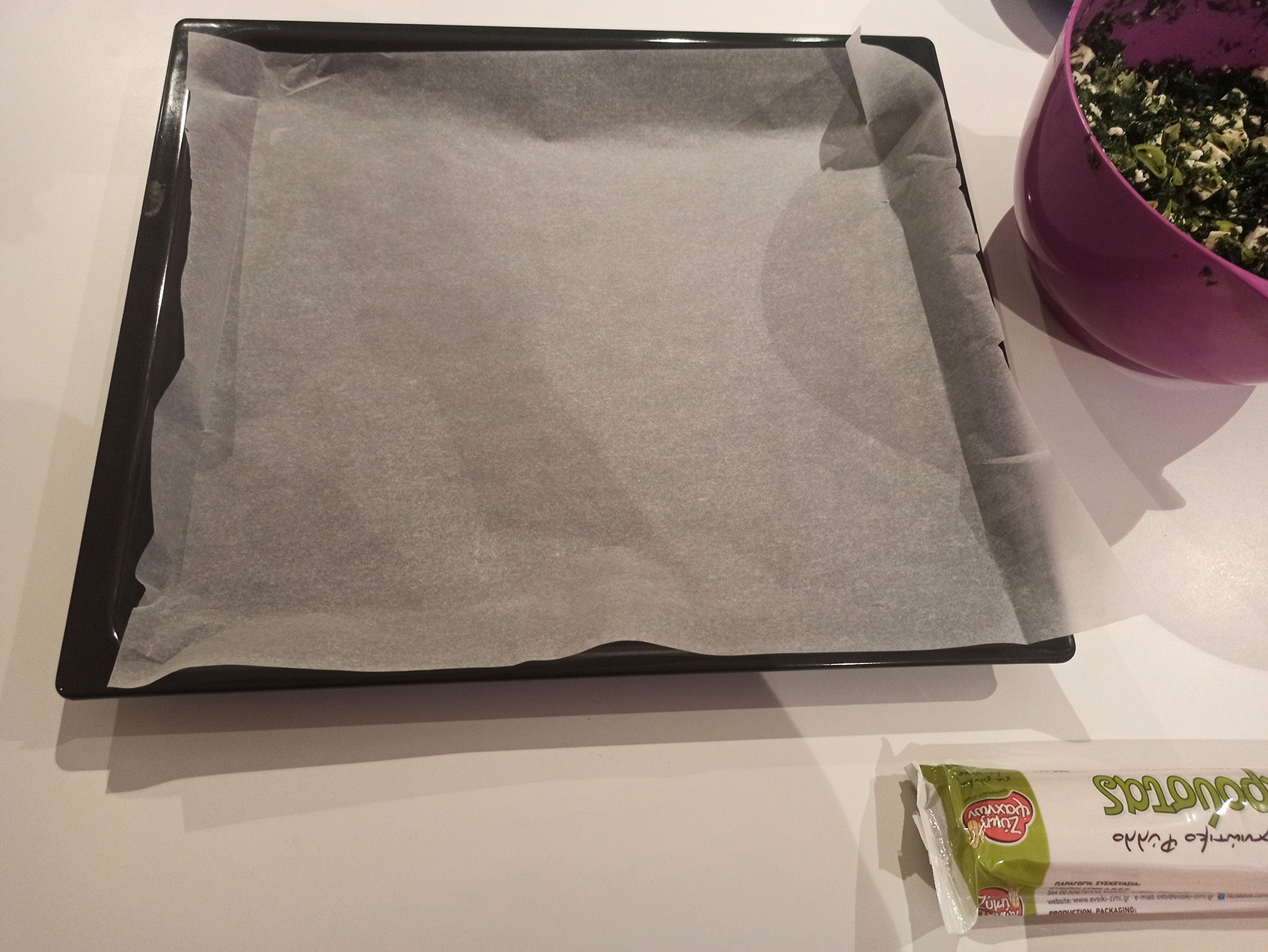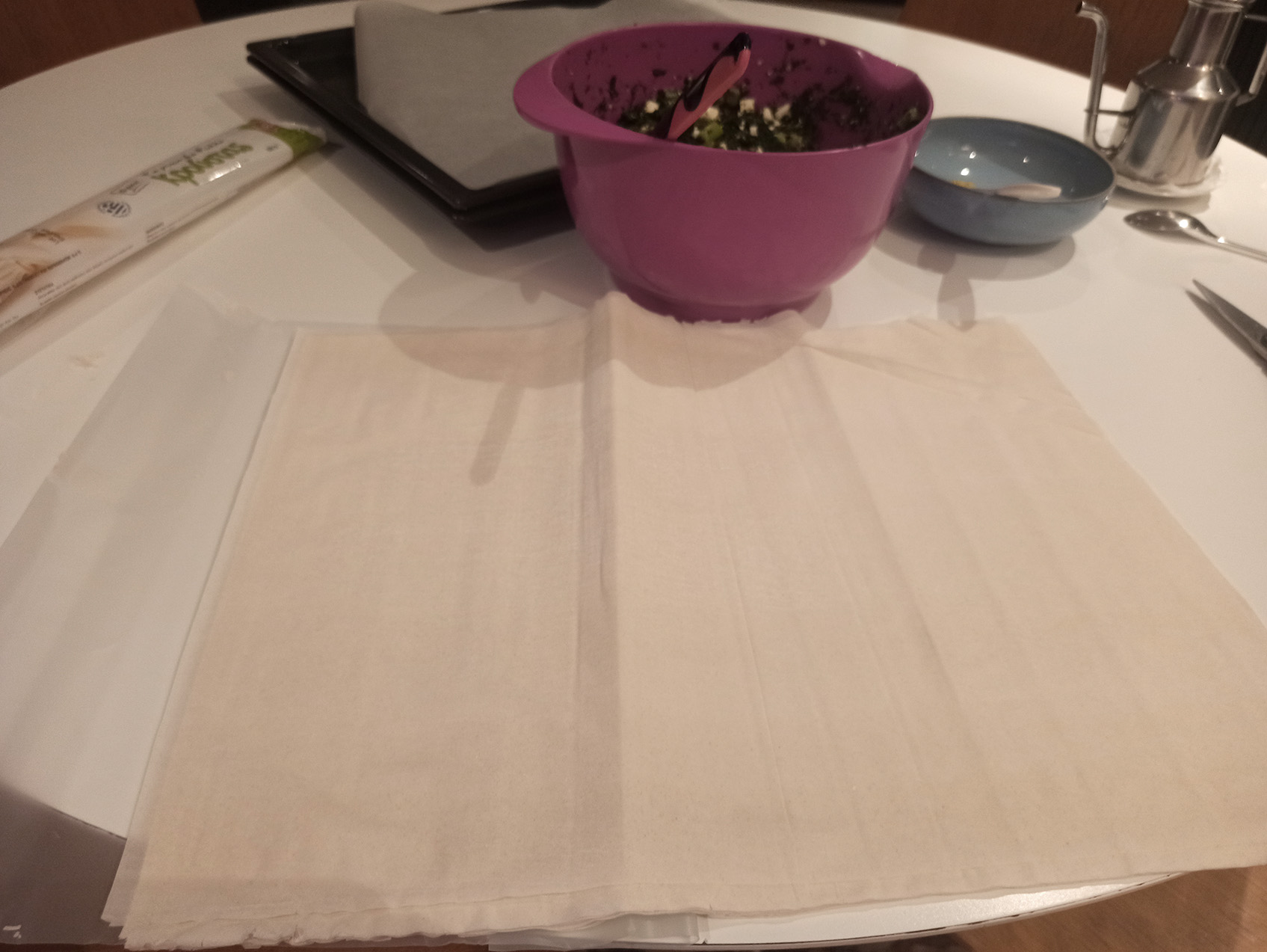 Put greaseproof paper to our 2 pans. Open the fyllo package and un-roll the roll of fyllo leaves. Using a scissor, cut the fyllo leaves in two in the middle of the long side. It doesn’t matter if the leaves are not perfectly cut into two, but we need to be careful not to rip them as we won’t be able to use them then. This way we get double the leaves and rolls.
